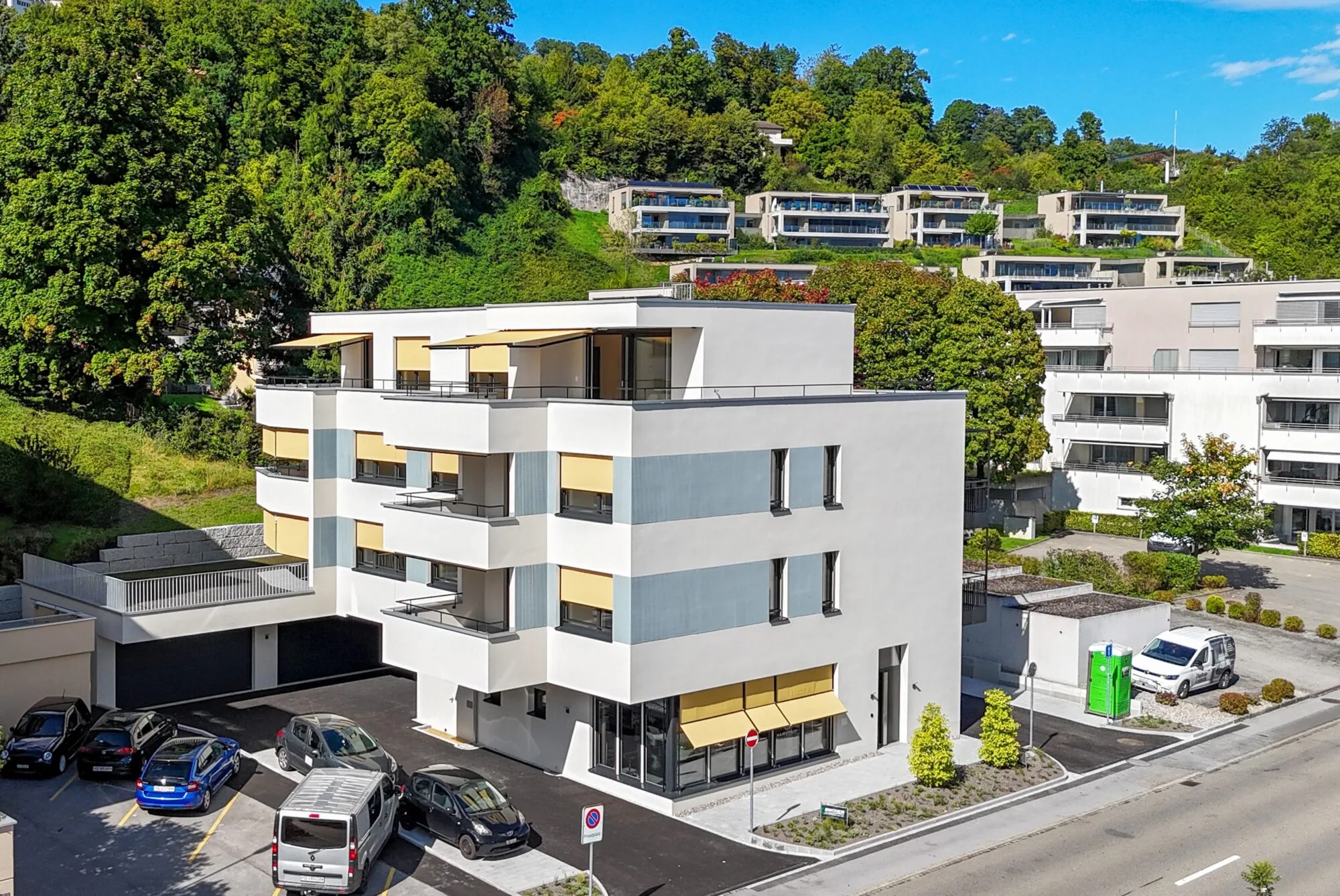 Im Innern überzeugen die Wohnungen durch grosszügige Küchen, Bodenheizung und vor allem durch breite, geschützte Balkone. Massive Brüstungen und Schallschutzdecken schaffen trotz der exponierten Lage einen ruhigen Aussenraum. Das Energiekonzept mit Erdsonden und einer Photovoltaikanlage auf dem Dach entspricht dem heutigen Stand der Technik und sorgt für zeitgemässen, nachhaltigen Betrieb.