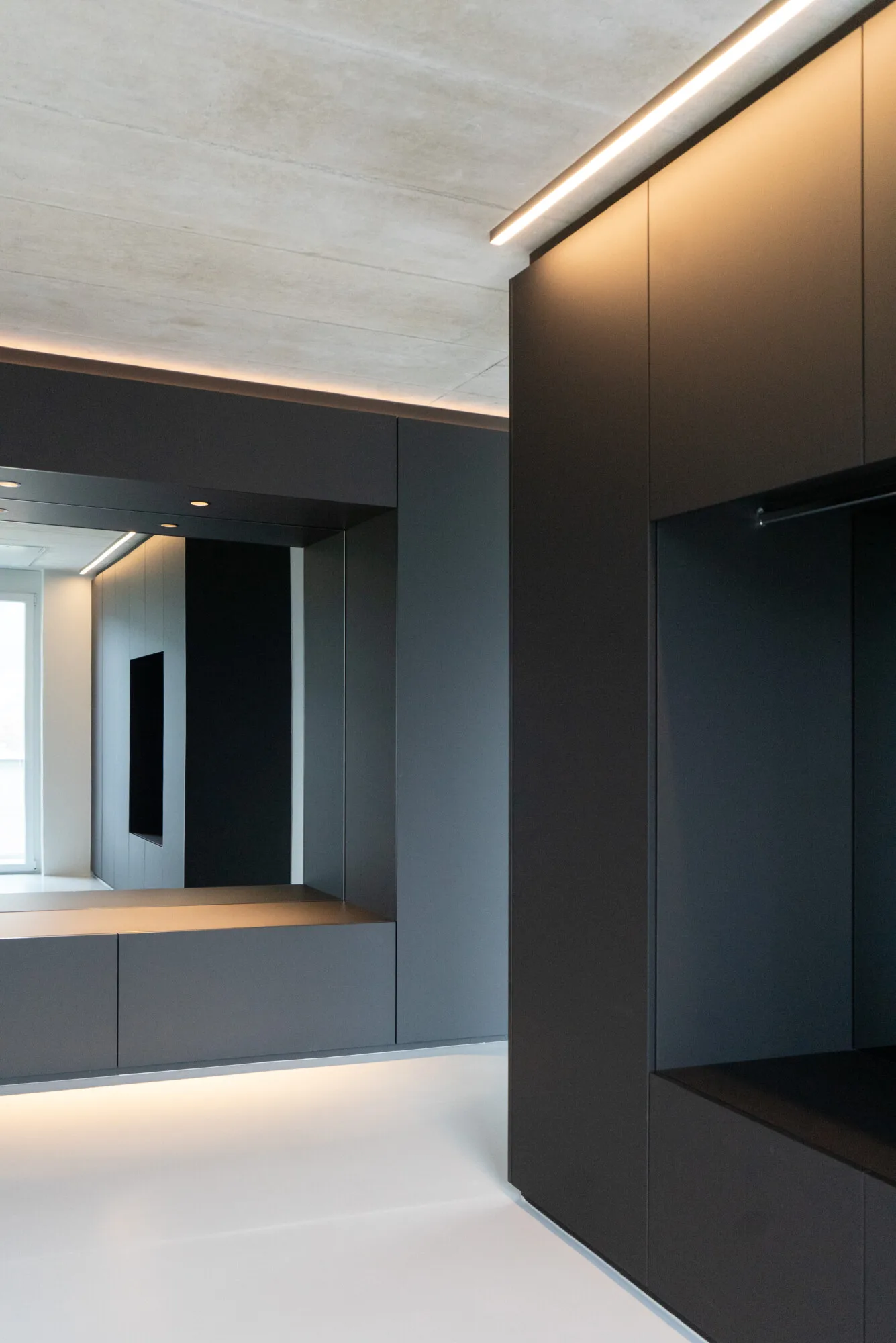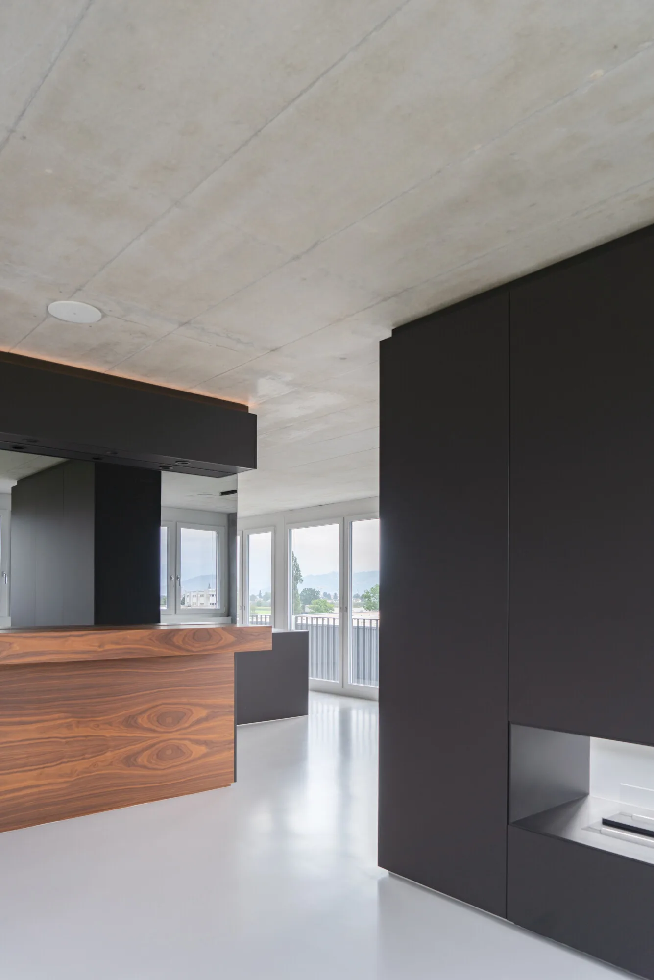 Jede Seite des Kernelements nimmt eine spezifische Funktion ein. So findet an der Längsseite die Küche mit vorgesetzter Insel Platz, auf den anderen Seiten eine grosszügige Garderobe mit Einbauschränken. Ein Herzstück der Wohnung liegt an der Schmalseite des Kerns, wo eine Hausbar Platz und Stimmung für gemütliche Abende mit Freunden schafft.