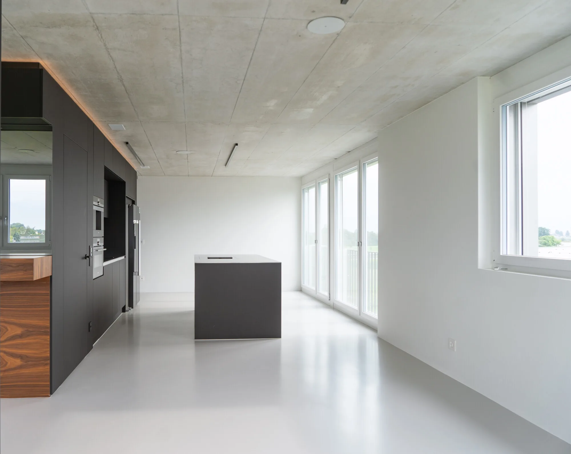 In einem industriell geprägten Kontext wünschte sich die Eigentümerschaft ein zweckmässiges, aber elegantes Wohnen. Ein eingschobener Kern gliedert den loftartigen Raum in unterschiedlich Bereiche für Kochen, Essen und Wohnen. Er enhält die untergeordneten Räume wie Reduit und Toilette.