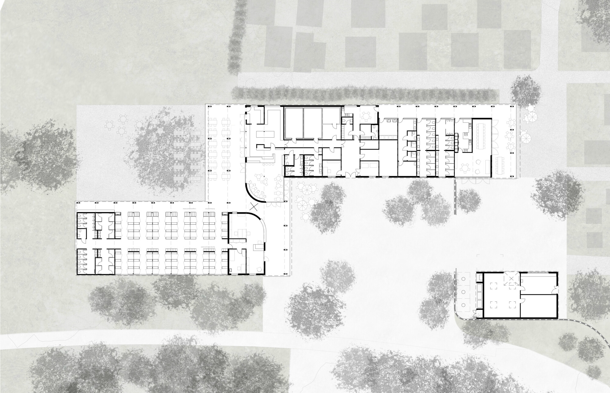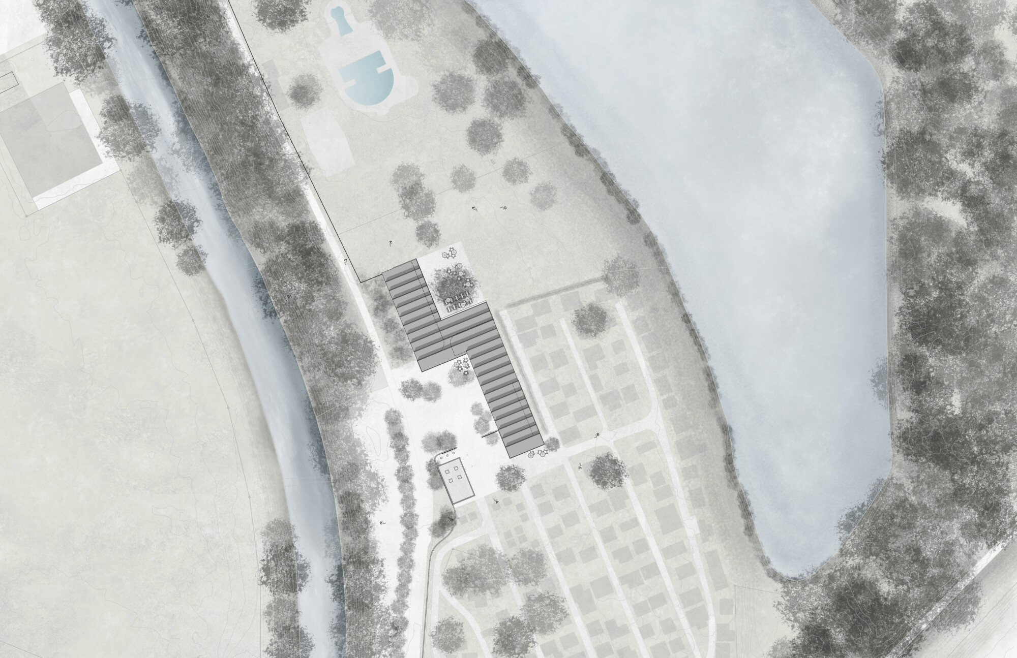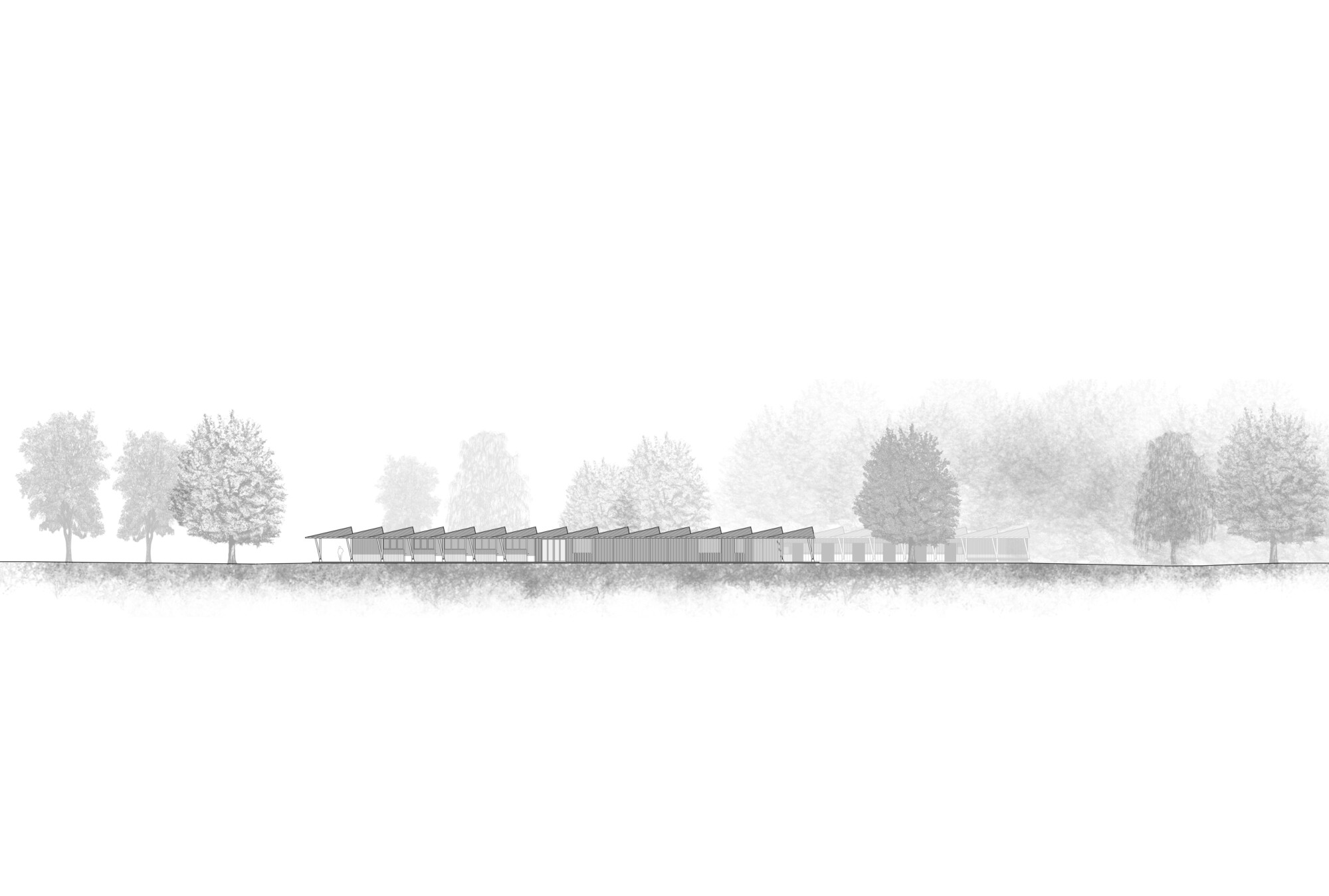 Im Rahmen eines öffentlichen Projektwettbewerbes suchte die Gemeinde St. Margrethen Vorschläge für ein neues Strandbad am Bruggerhorn. Als mehrarmiger Holzbau mit gezacktem Dach versuchte unser Vorschlag, die vielfältige Landschaft und die umgebenden Nutzungen einzuklammern und zu verbinden.