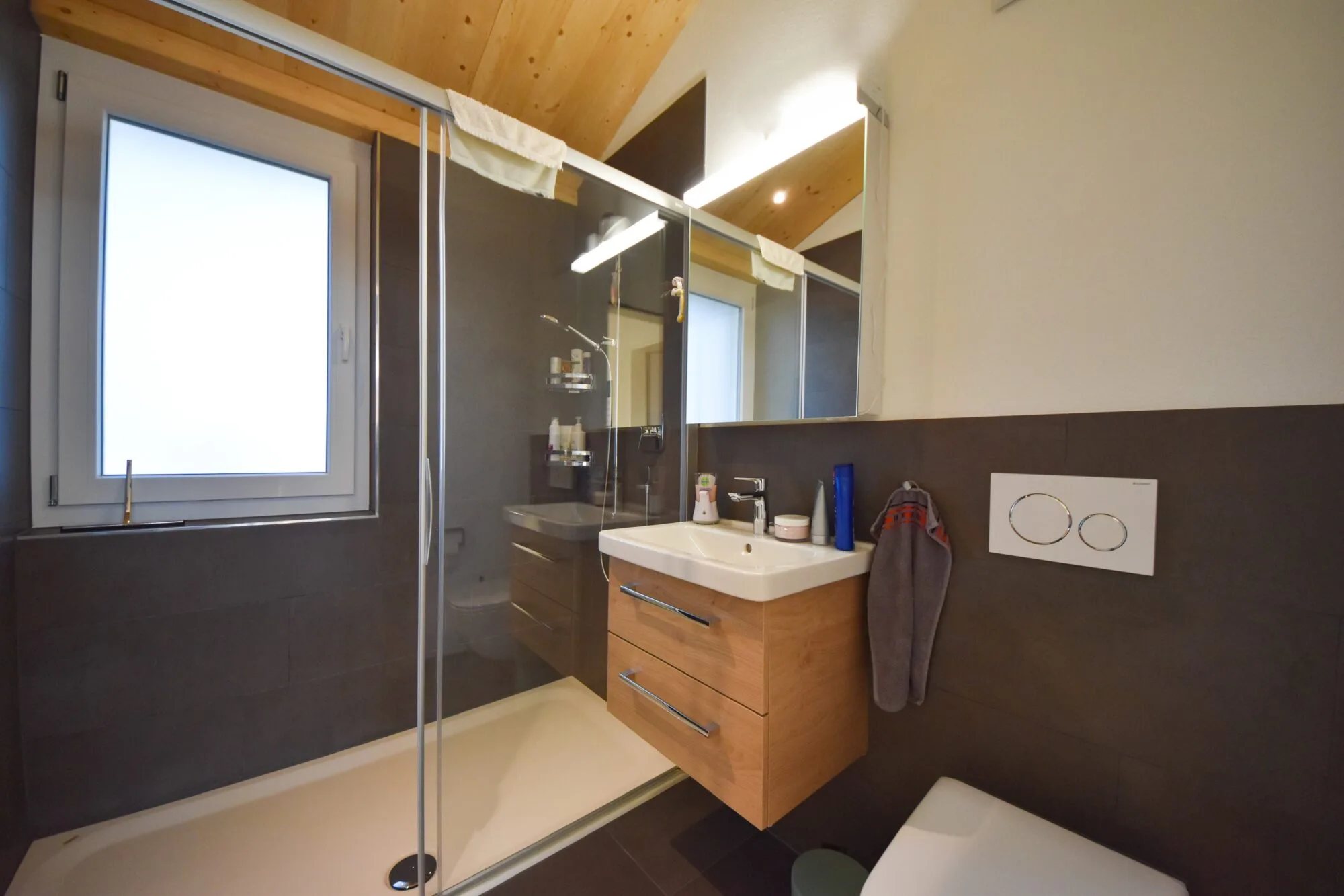 Hochwertiger Innenausbau mit Eichenparkett in allen Wohn- und Schlafzimmern, moderner Kachelofen, Einbaumöbel und überhohe Räume unter der Dachschräge. Zur Wohnung gehören zwei Tiefgaragenplätze sowie ein Kellerabteil.