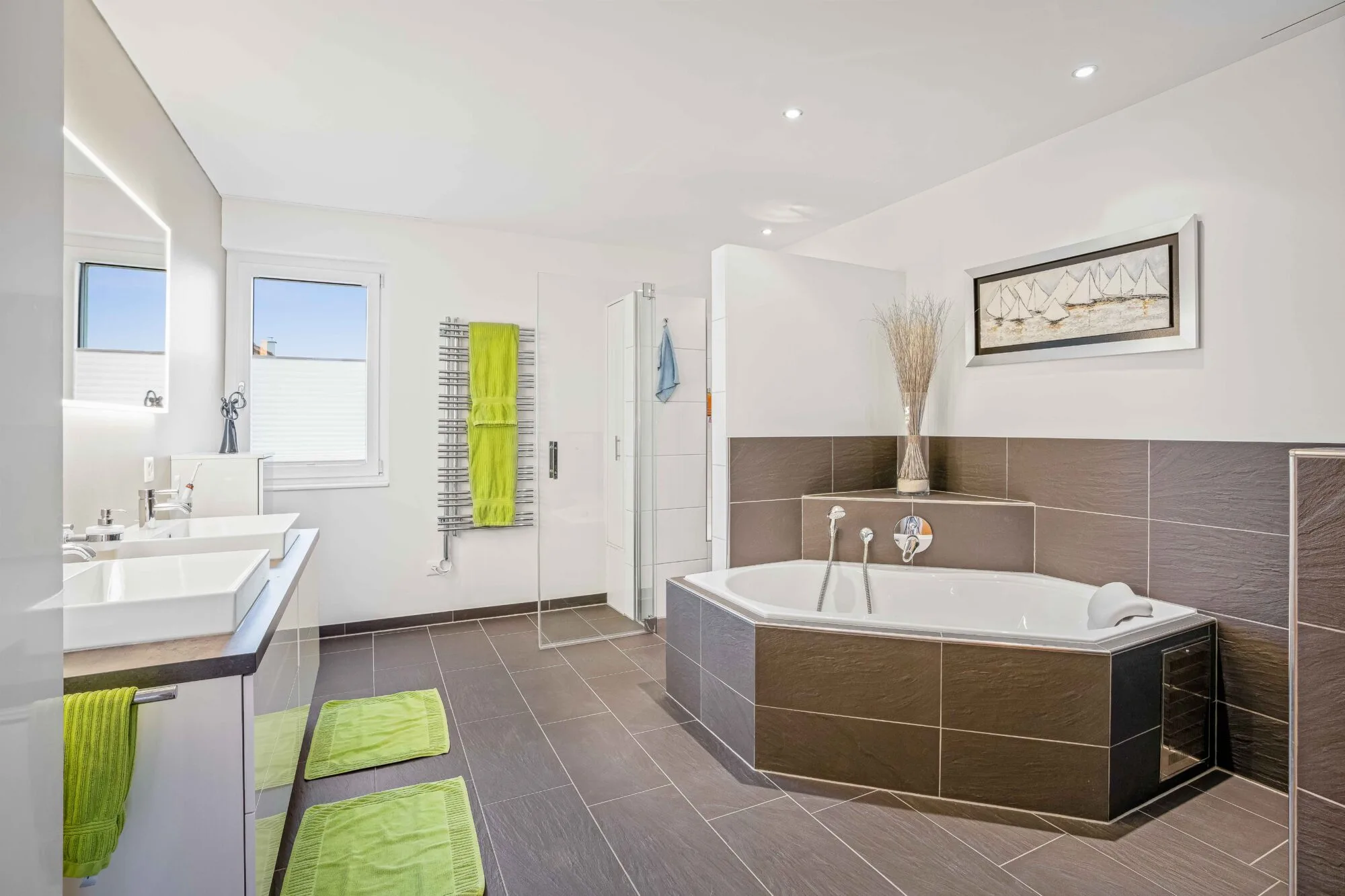 Das grosse Badezimmer ist mit einer Whirlpool-Badewanne ausgestattet und lädt zum Entspannen ein. Der gepflegte Aussenbereich mit Garten bietet viel Platz zum Verweilen im Freien. Eine Doppelgarage mit elektrischem Garagentor rundet das attraktive Angebot ab.