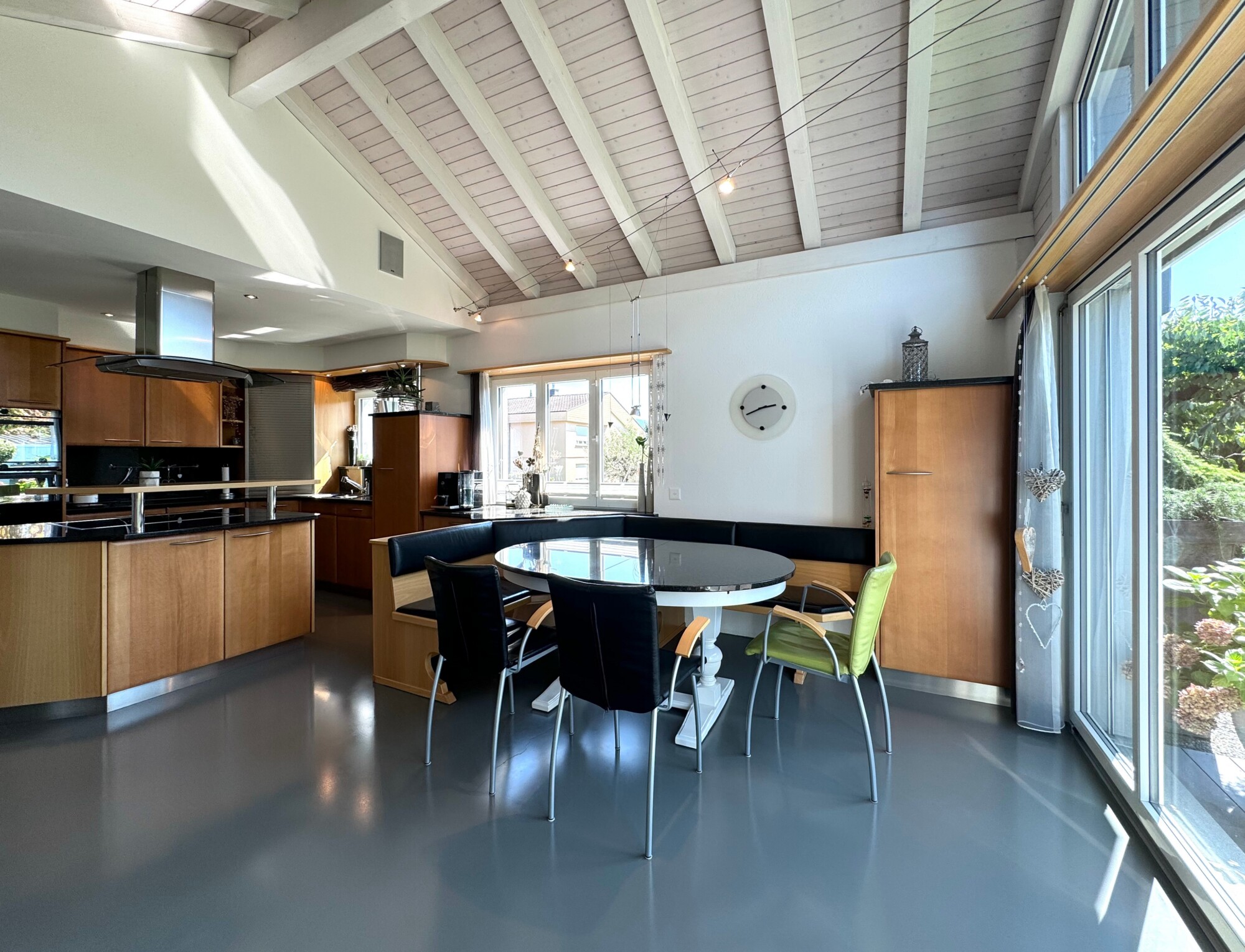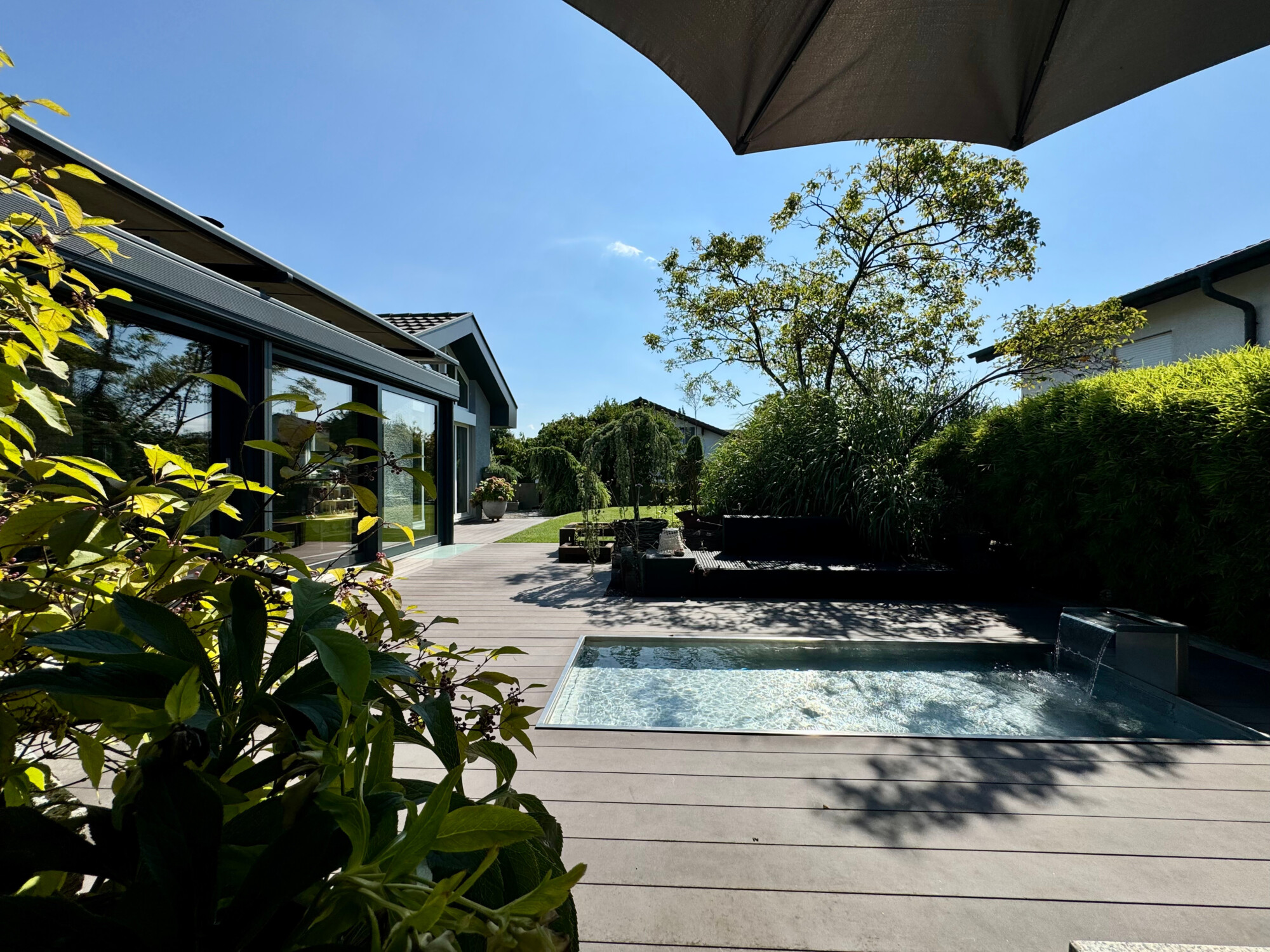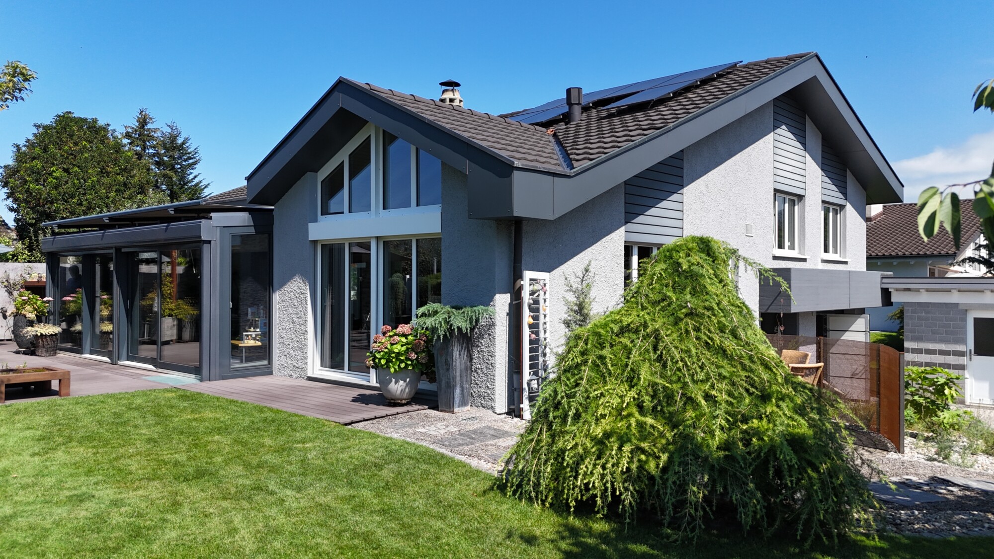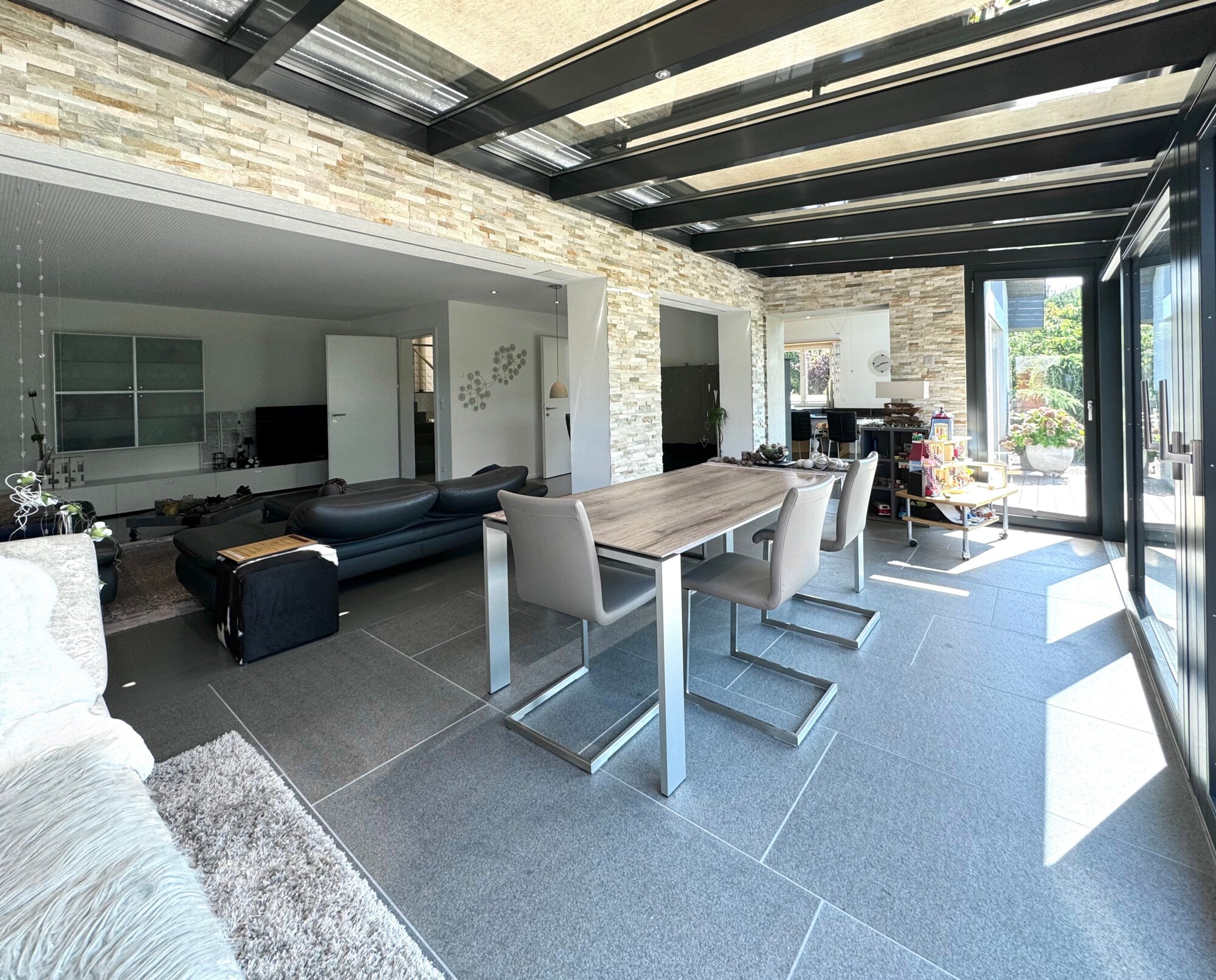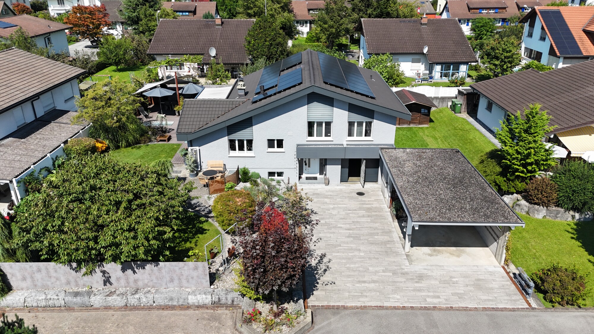 Dieses freistehende Einfamilienhaus bietet über 160 m² Wohnfläche mit einer durchdachten Raumaufteilung. Es befindet sich in ruhiger, dennoch zentraler Lage. Der exklusive Garten mit Wasserspiel, Sonnensegel und Sichtschutz schafft eine idyllische Oase. Das Haus überzeugt durch hochwertige Materialien, ein zeitloses Design, grosszügige Stauraummöglichkeiten, moderne Haustechnik sowie eine Photovoltaikanlage. Highlights sind der beheizte Wintergarten, der Kachelofen im Wohnzimmer und die Sauna im Untergeschoss.